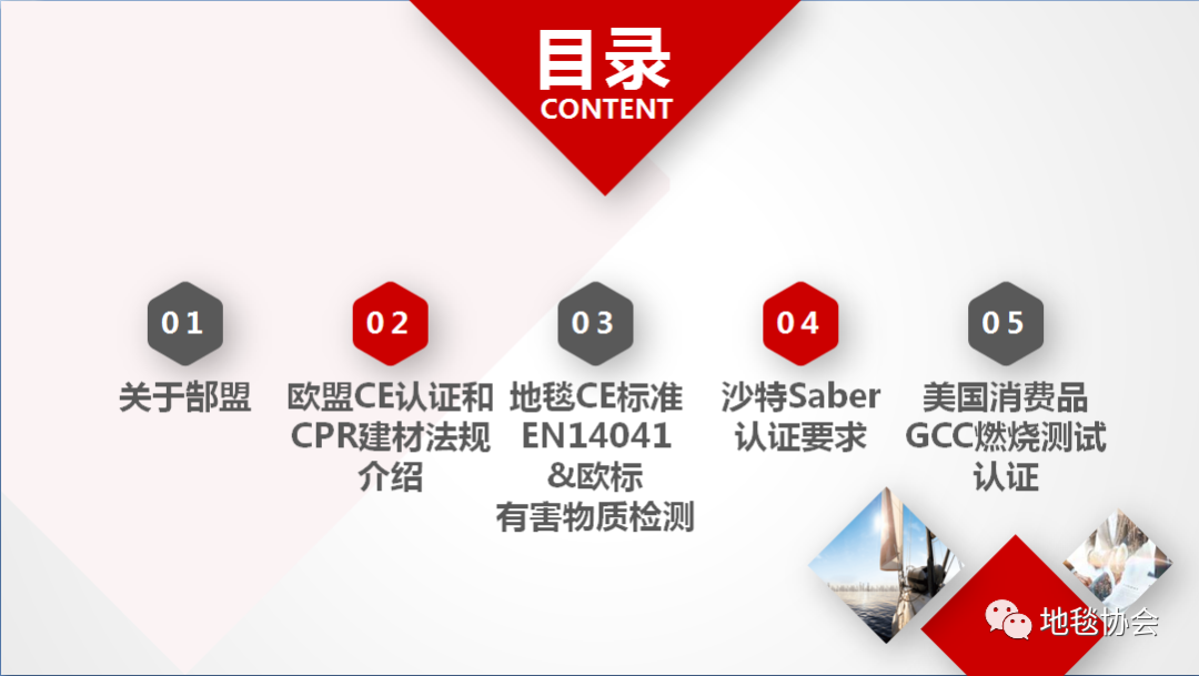會議第二項內容,由上海郜盟高田經理講解歐盟CE介紹和CPR建材法規介紹,地毯CE標準以及歐盟有害物質檢測,沙特Saber認證要求,美國消費品GCC燃燒測試認證。